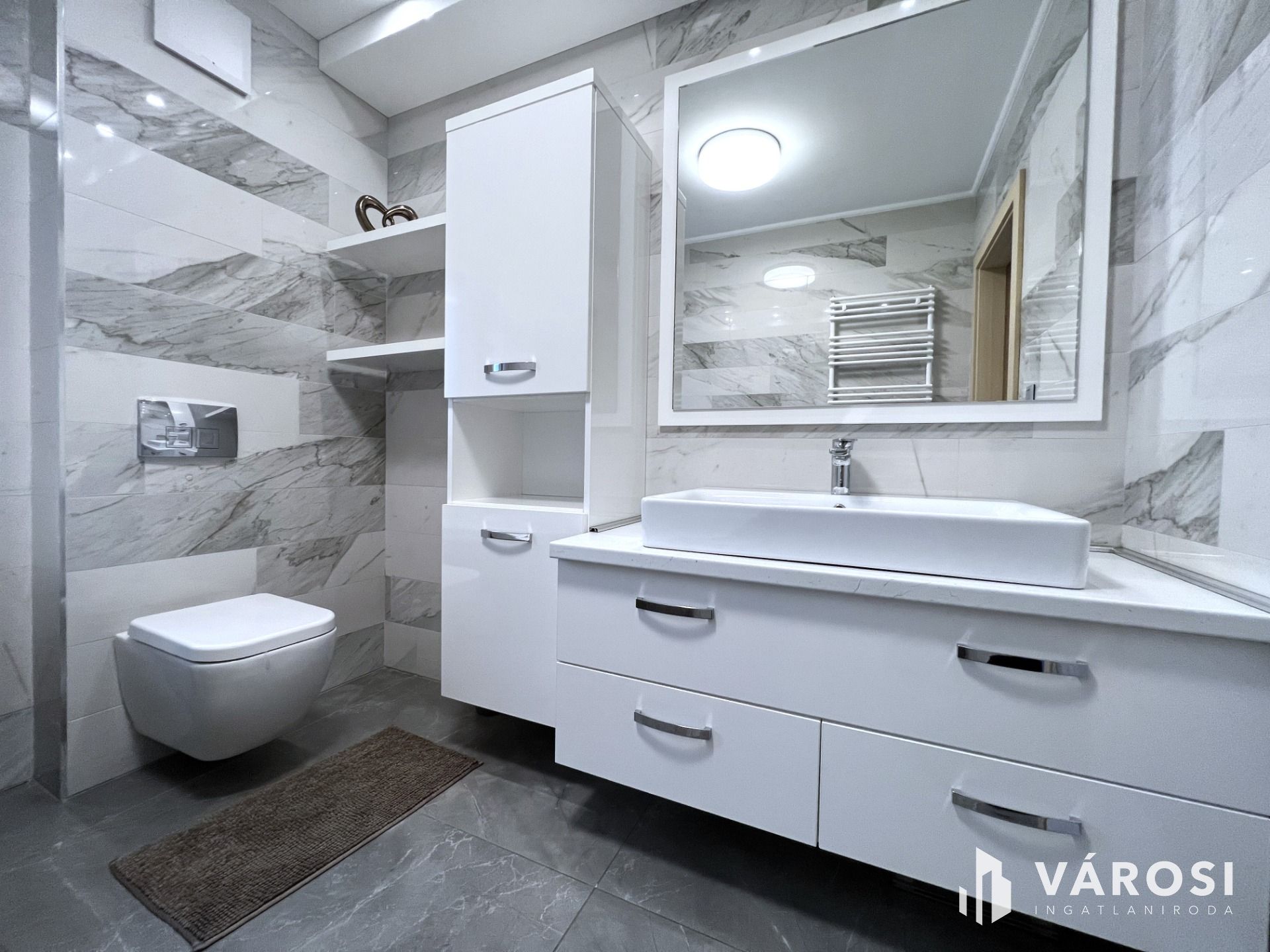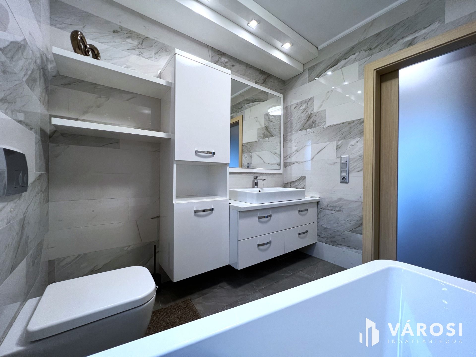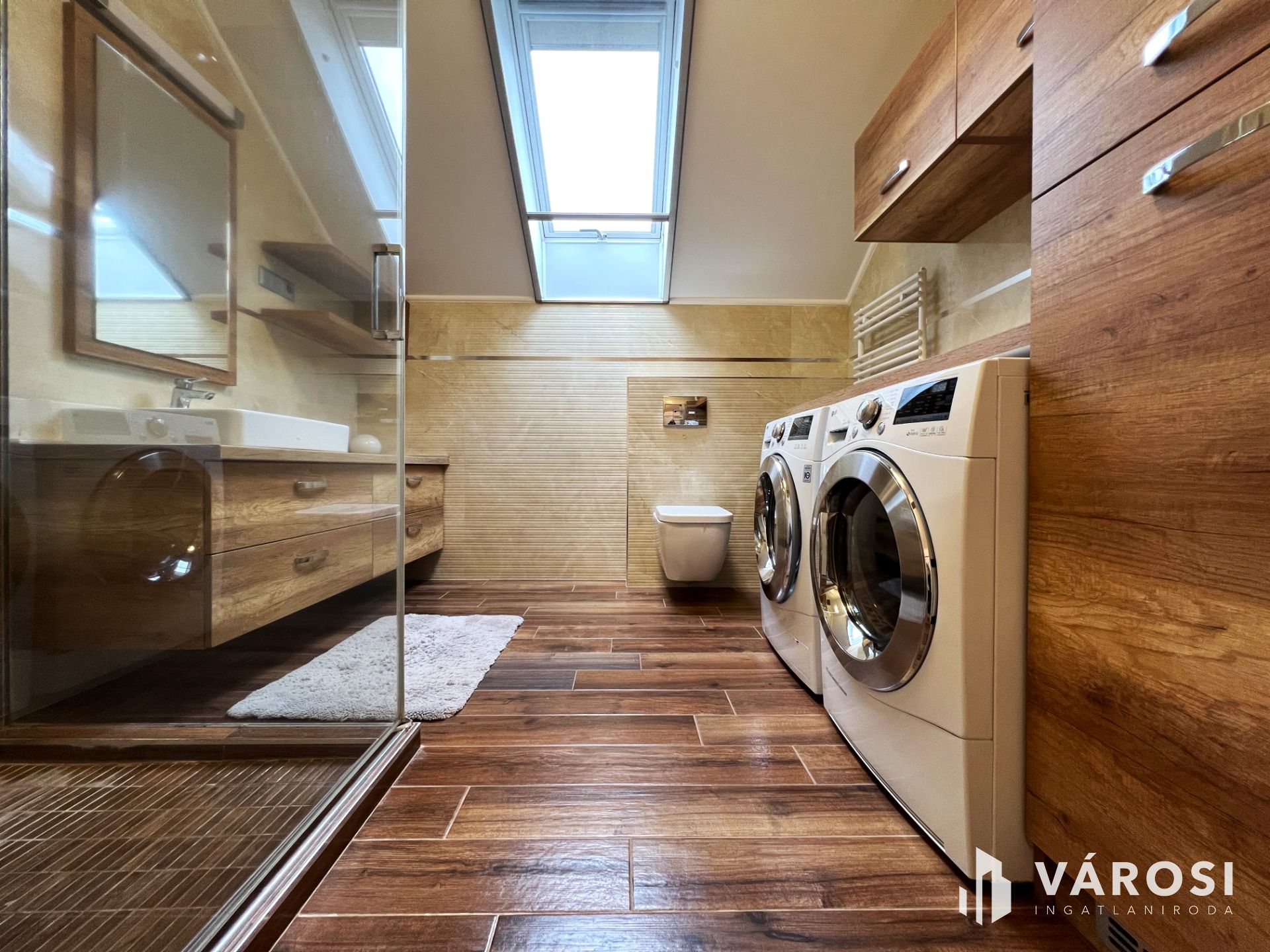 A földszinten található egy minden igényt kielégítő amerikai konyhás nappali, egy tágas kádas fürdőszoba wc-vel, gardrób, külön wc-bidé, közlekedő-mély pakolható gardrób szekrényekkel, továbbá egy világos modern hálószoba.
