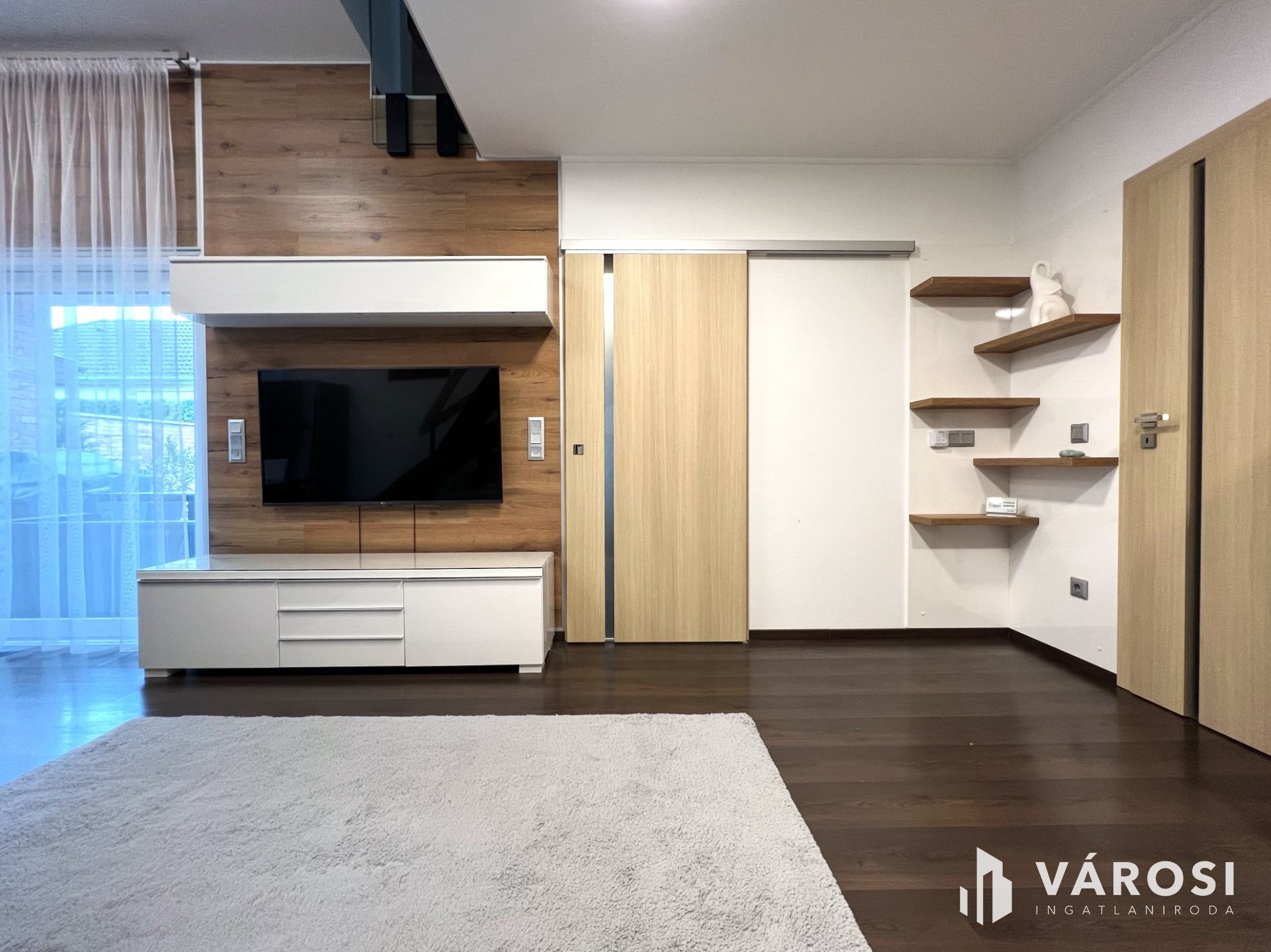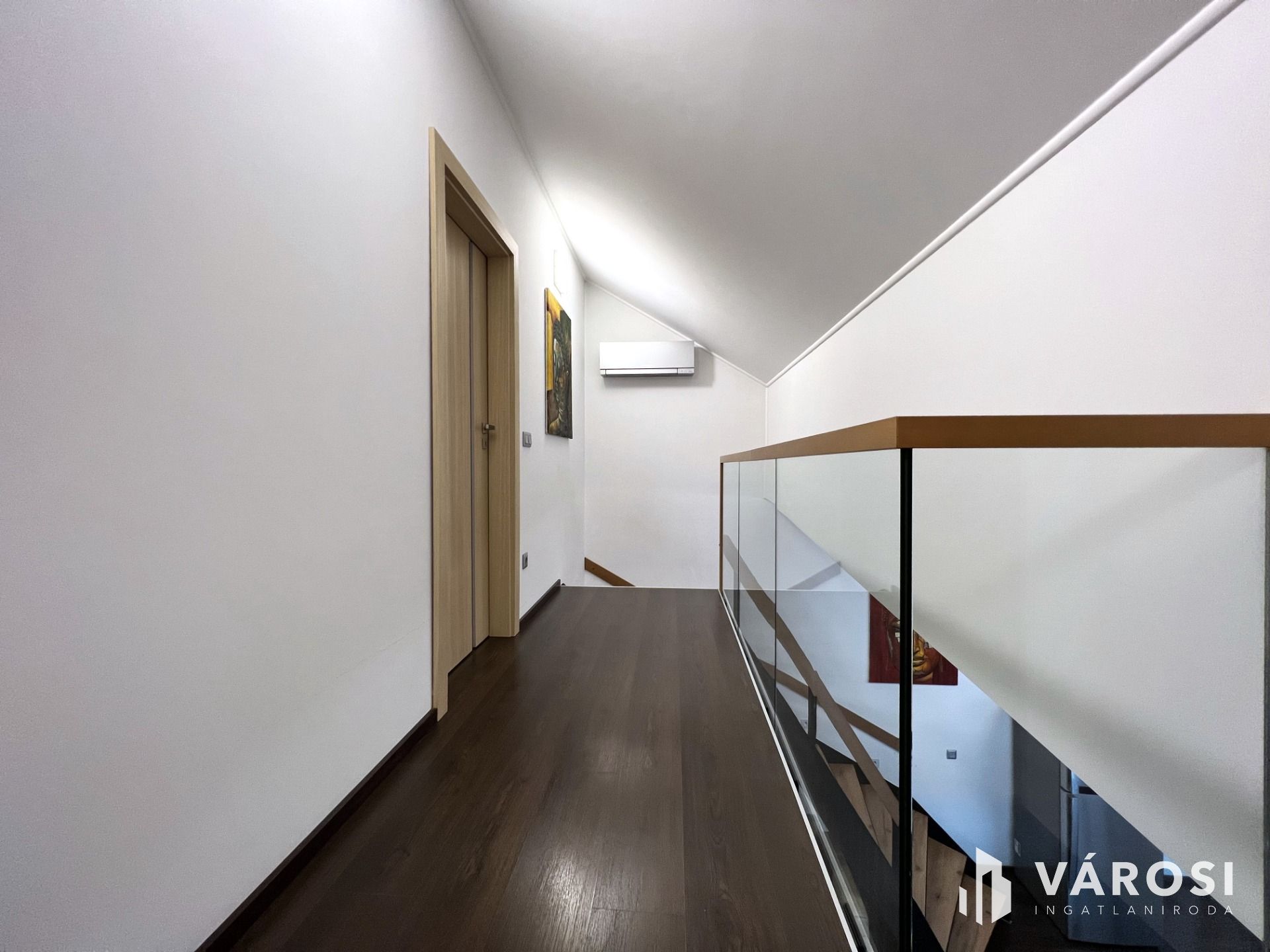 Minden helyiség bútorozott, nagyon szép anyagok, falburkolatok kerültek felhasználásra. A nappaliból az emeletre egy minimál tervezésű modern lépcsőn juthatunk, ahol üveg korlátok teszik még elegánsabbá, légiesebbé a teret.