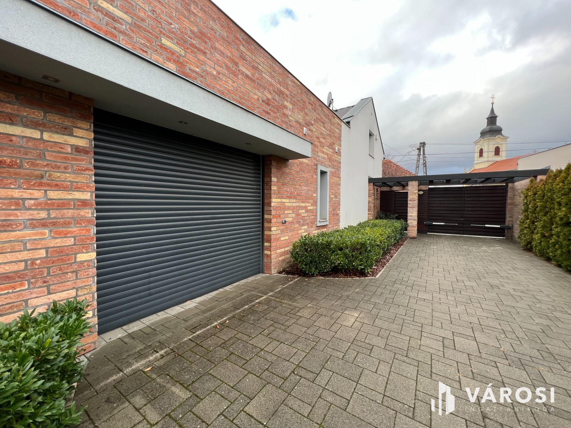 Az udvaron található még egy fedett gépkocsibeálló, és a bejárat, a salgó polcokkal beépített, elektromos garázskapuval felszerelt kényelmes garázsba.