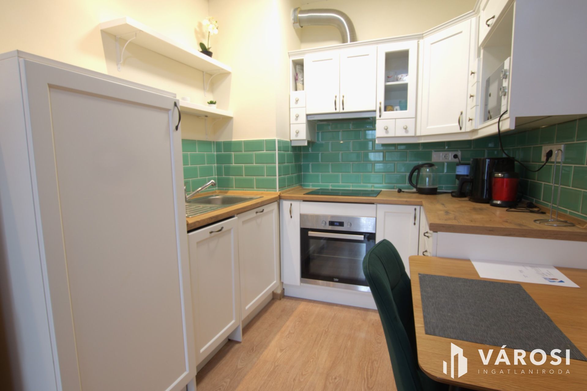 A lakberendező által tervezett belső tér egyszerre letisztult és praktikus: amerikai konyhás nappali + háló, külön fürdő és külön WC, valamint beépített gardrób. A konyha teljesen gépesített, és a vételárban benne van több extra is (AEG mosógép, Klarstein szárítógép, elektromos redőnyök, szúnyogháló, hangulatvilágítás).