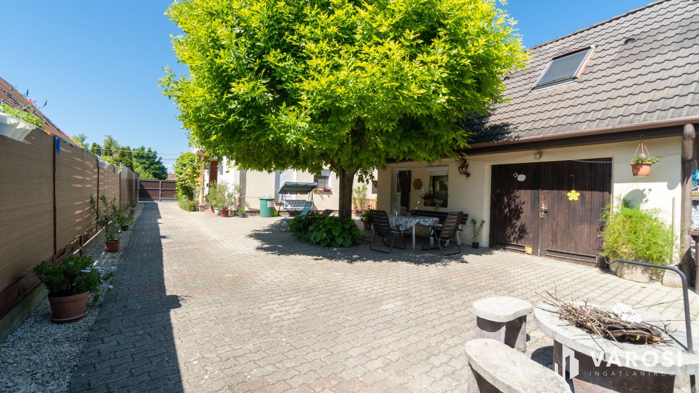 A kert parkosított és gondozott, ahol gondtalanul élvezhetjük kellemes nyári estéket. A kertben rendelkezésre áll fúrt kút is az öntözéshez. Az udvarban több autó számára térkövezett beálló van biztosítva.