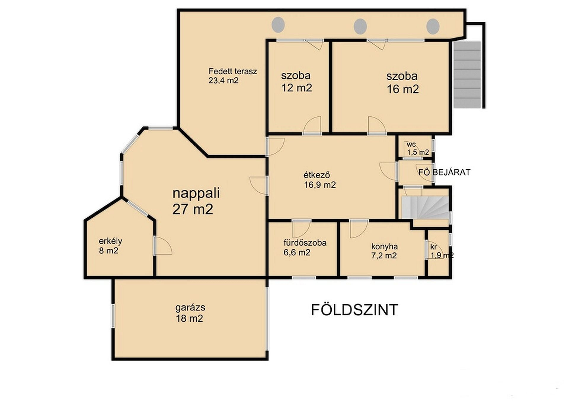 - földszintjén külön bejárattal: konyha-étkező mellett nappali, és 2 szoba, valamint fürdőszoba, kamra, egy nagyméretű erkély, valamit garázs kapott helyet.