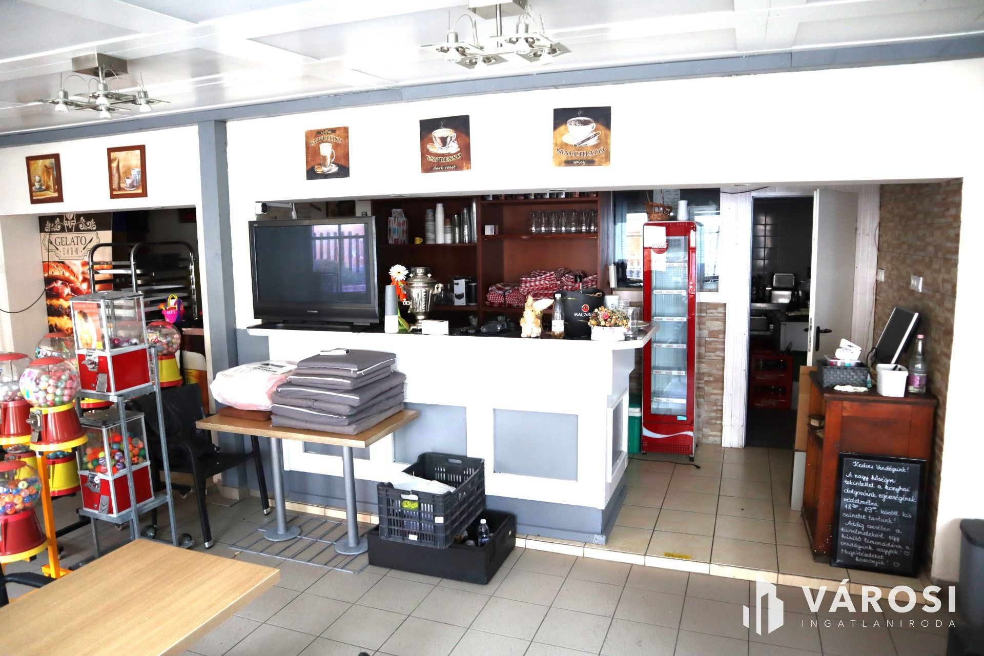 A 120 m²-es két szintes épület kiváló állapotban van, mivel az évek során folyamatosan karbantartották és felújították. A földszinten elhelyezkedő jelenleg pizzériaként működő vendéglátóhely felszerelt konyhával (teljes technológiával, HACCP minősítéssel) és berendezett vendégtérrel rendelkezik, amely a vételár részét képezi.