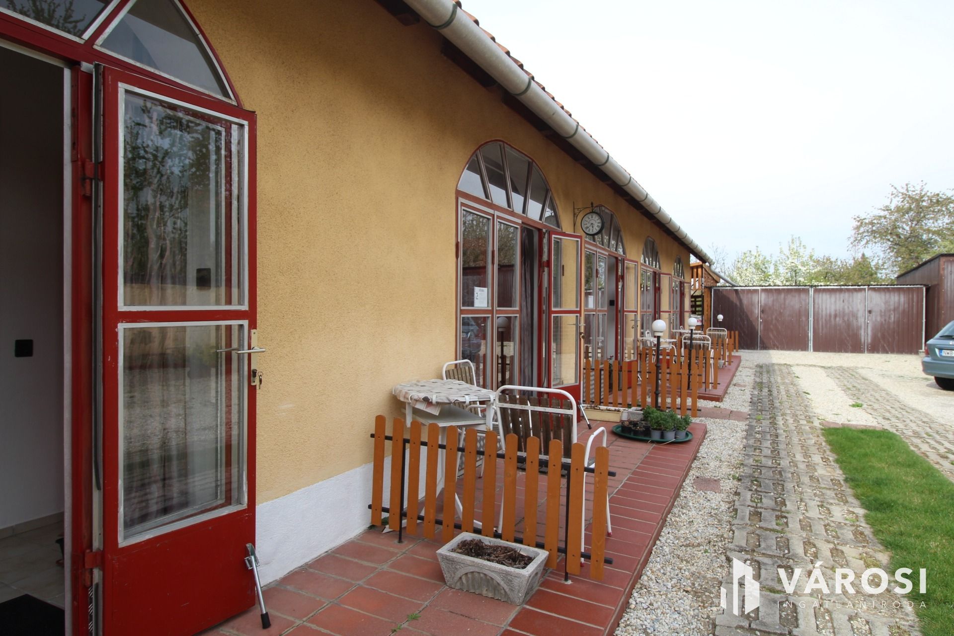 Jelenleg a vendégek számára kialakított parkolók és egy fedett terasz, tároló helyiség valamint 3 garázs kapott helyett, hátul kellemes pihenőkert résszel.