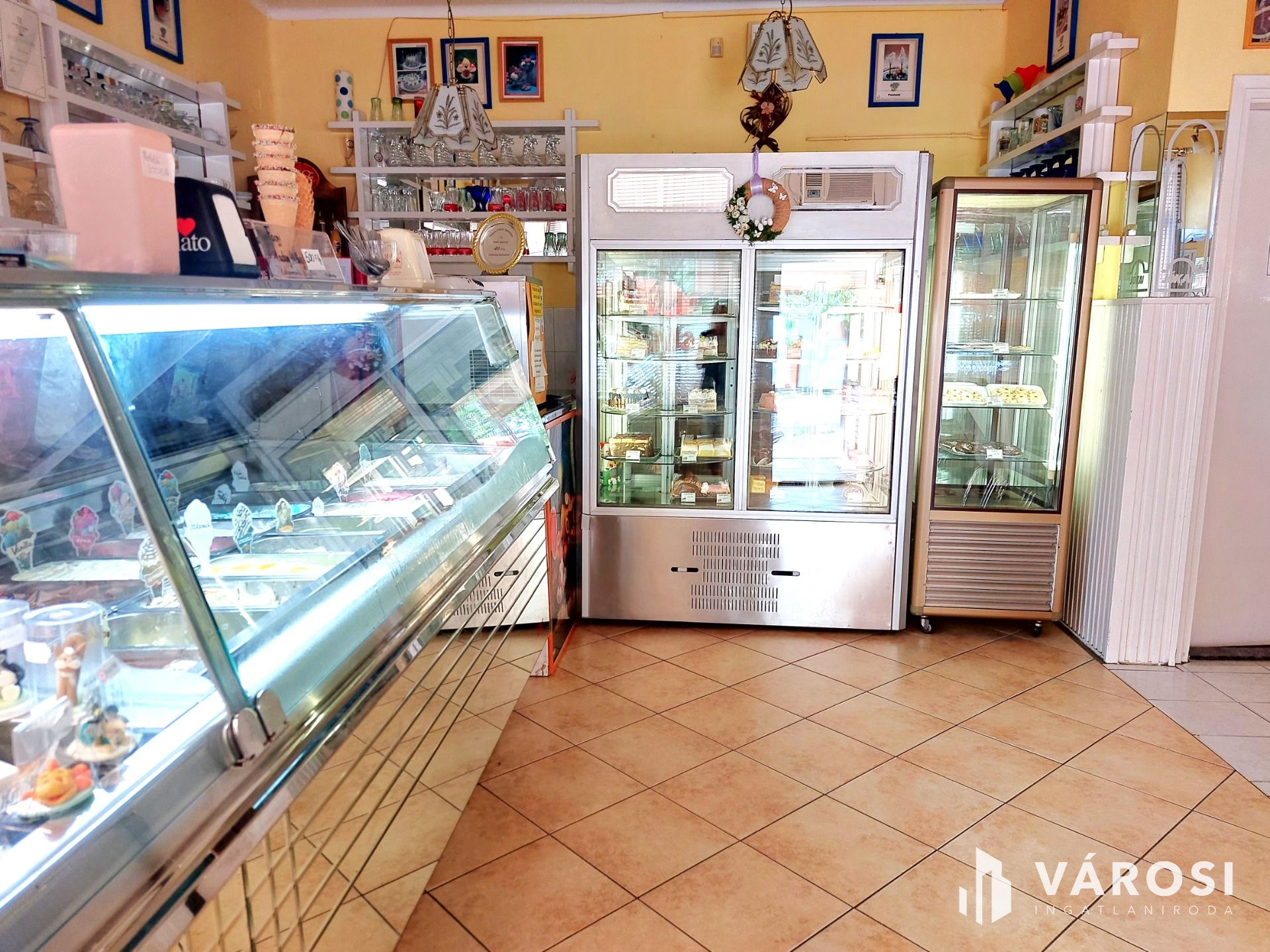 A földszinten, 83m2 alapterületen a több, mint 40 éve működő, ma is népszerű Jókai Cukrászda, amelyhez a melléképületben kialakított, professzionális berendezésekkel felszerelt cukrászüzem tartozik. A cukrászatban használt különleges olasz fagyigépek, pasztőröző gépek és más specifikus cukrászüzemi berendezések, felszerelések magas értéket képviselnek, melyet az eladási ár nem tartalmaz. Az ingatlan ebben az esetben kiürítve kerül átadásra.