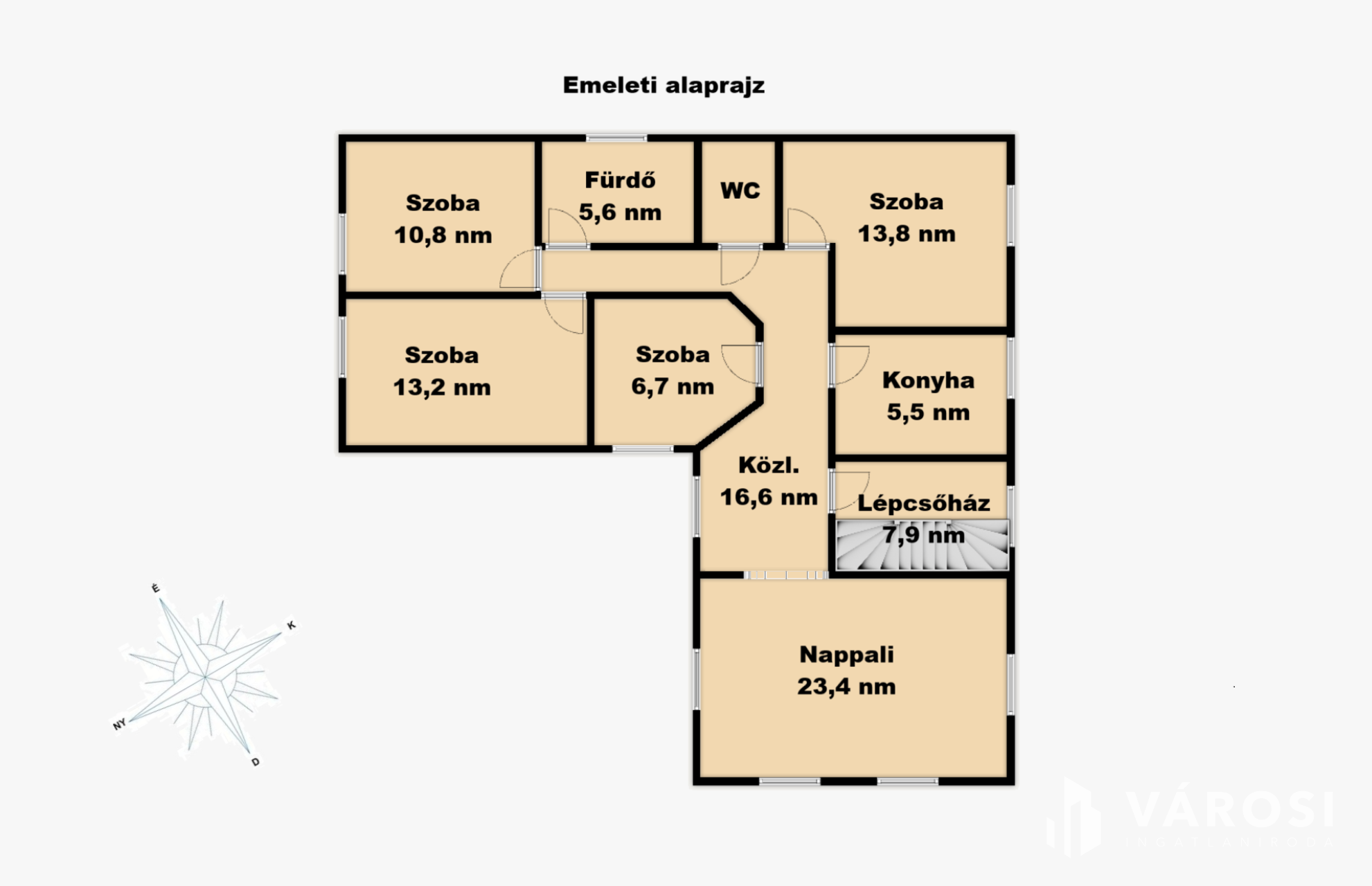 A tágas tetőtérben, további nappali, 3 napfényes szoba, 1 félszoba, konyha, fürdőszoba, wc helyezkedik el, 103 négyzetméteren.
