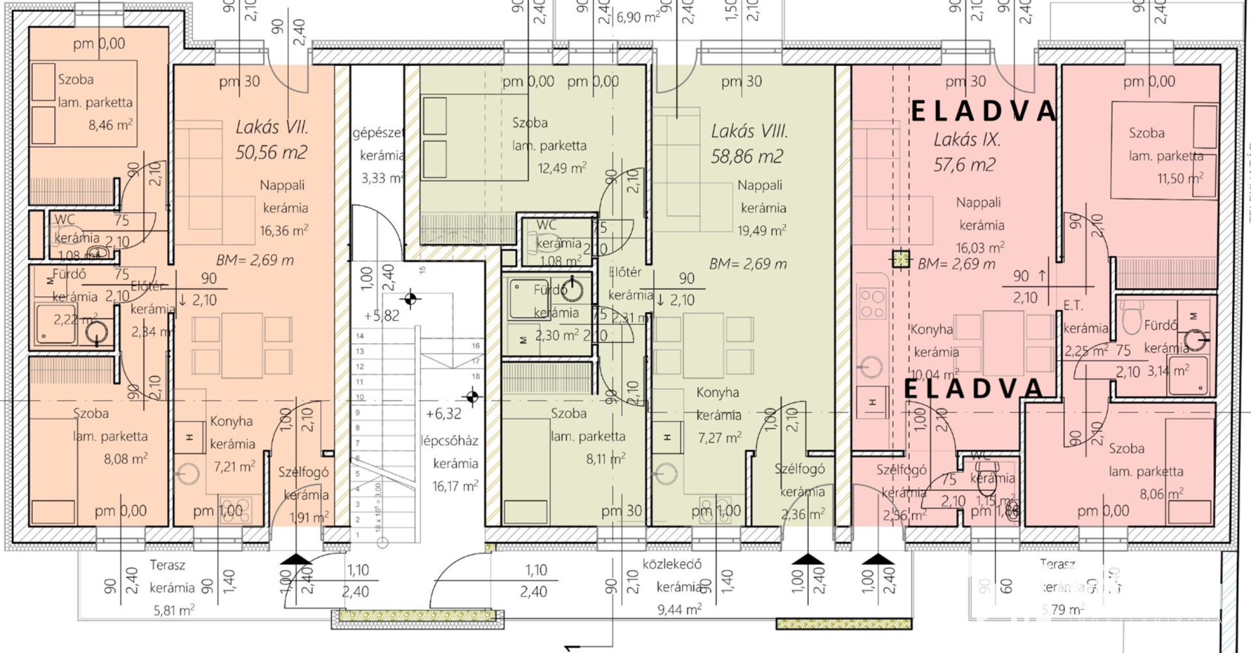 A társasház jellemzői: földszinti lakások és üzlethelyiségek, következik 3 szint plusz tetőtér.