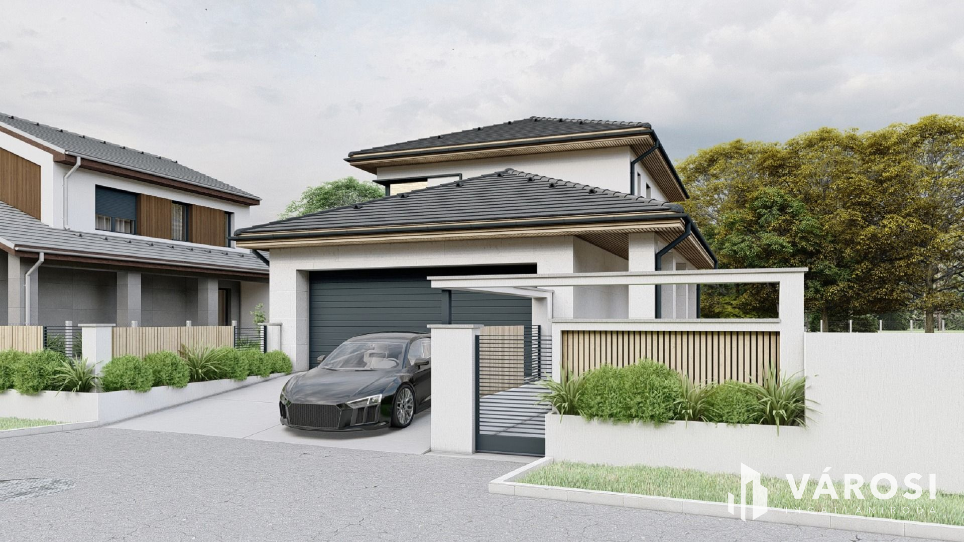 - külső részen: térburkolást a garázsbejáróban, ajtóban, termőföld feltöltést, kerítést