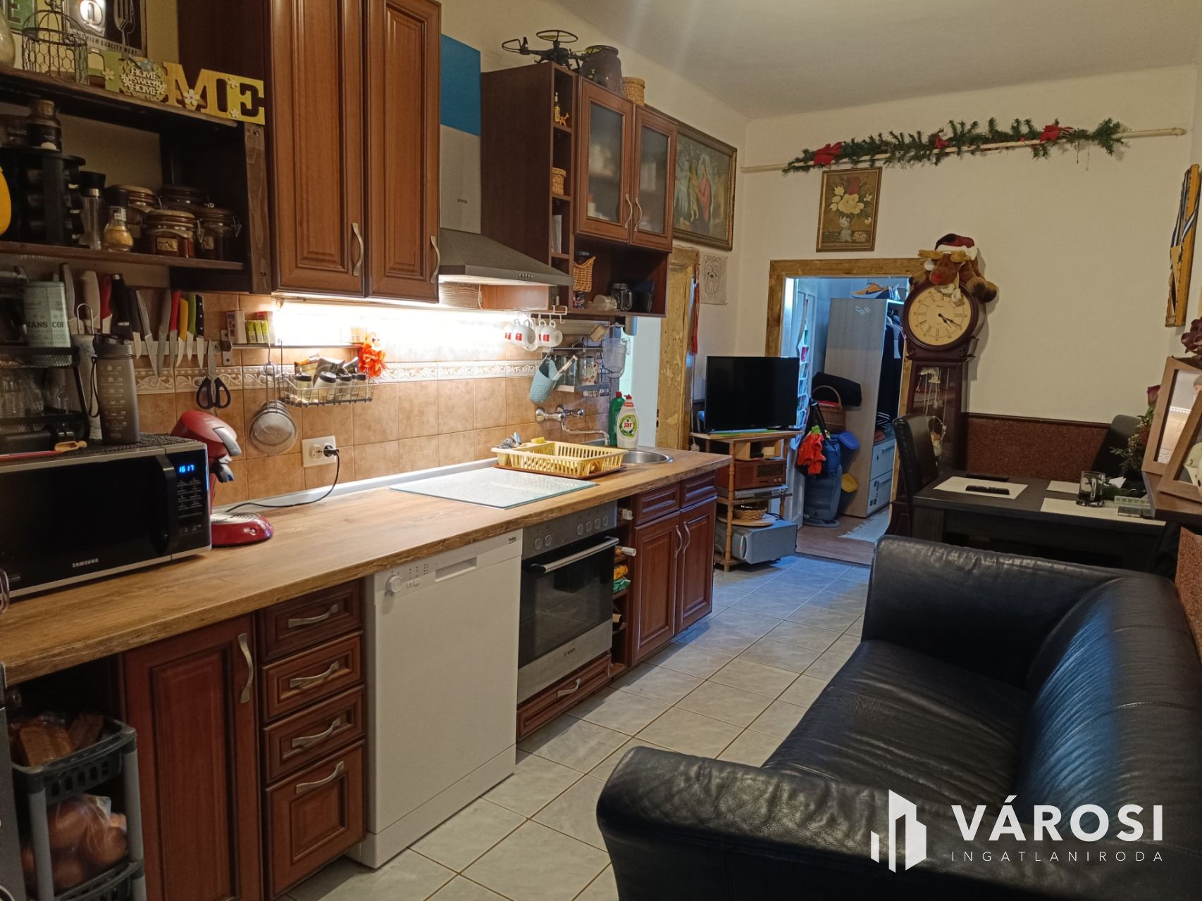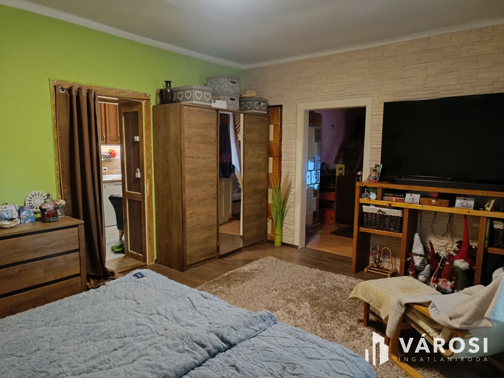 A fedett teraszról a folyosóra jutunk, melynek végén egy kis cukrász helyiség található. A bejárattal szemben a konyha helyezkedik el, innen nyílik a fürdőszoba, egy tároló, valamint jobbra a szobák. A két nagy szoba egymásból nyílik, mindkettőt működőképes cserépkályha díszíti.