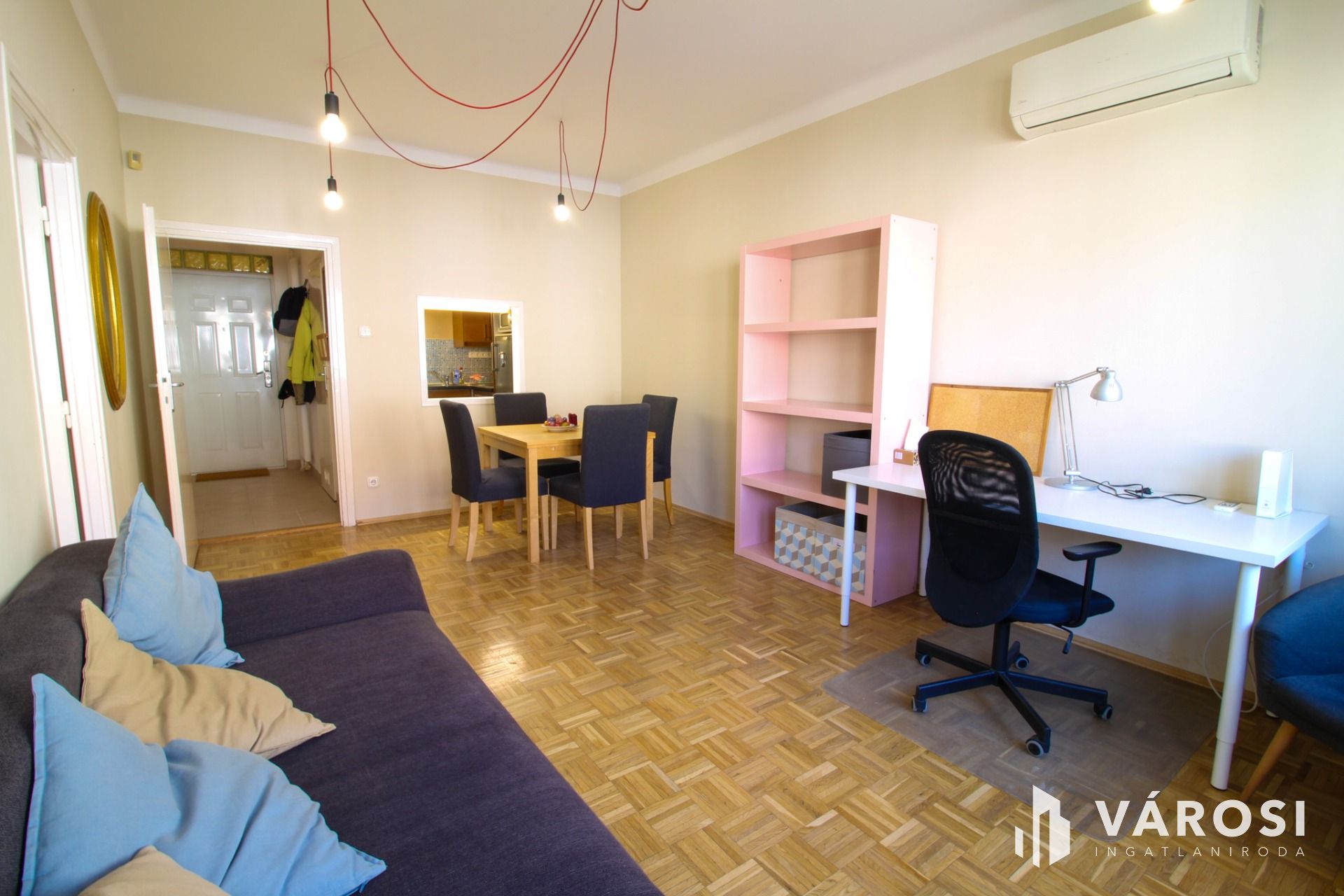 A one-and-a-half-bedroom apartment is available for rent near Fővám Square on Só Street. The living room is spacious and bright, furnished with a sofa bed, a dining area, and a work area. The bedroom includes an additional closet for clothes and shoes. The bathroom has a shower stall, and the toilet is separate. The kitchen is modern and well-equipped, connected to the living room by a cozy window. The apartment is available fully furnished, but the furniture can be removed upon request, or new furniture can be brought in. It is fully equipped with a refrigerator, microwave, oven, dishwasher, washing machine, air conditioning, and a new energy-efficient water heater. The windows and doors were replaced in 2010. The balcony overlooks a quiet street and historic buildings, and a park with a playground is visible nearby.