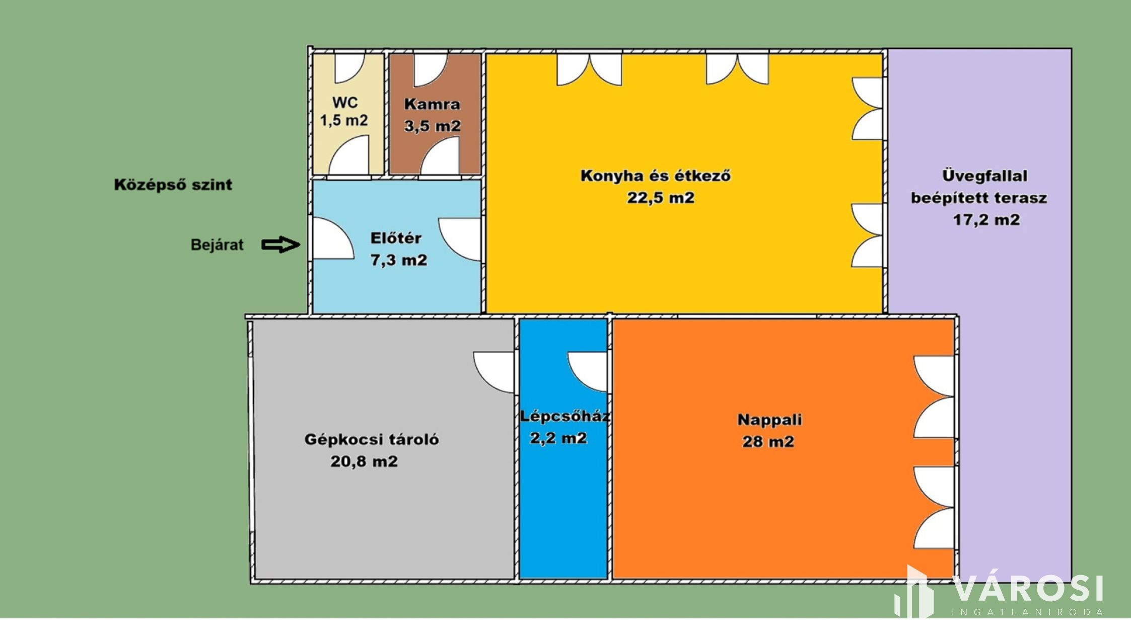 A földszinten, mely az utcafronttal van egy szintben, egy tágas, világos konyha-étkező fogadja az érkezőt, innen nyílik a 17 négyzetméteres, eltolható üvegfallal védett terasz, amely egész évben zavartalan panorámát kínál. A nappali meleg hangulata, a külön WC és kamra praktikus elrendezése és az elektromos kapuval felszerelt garázs még inkább növeli az otthon értékét.