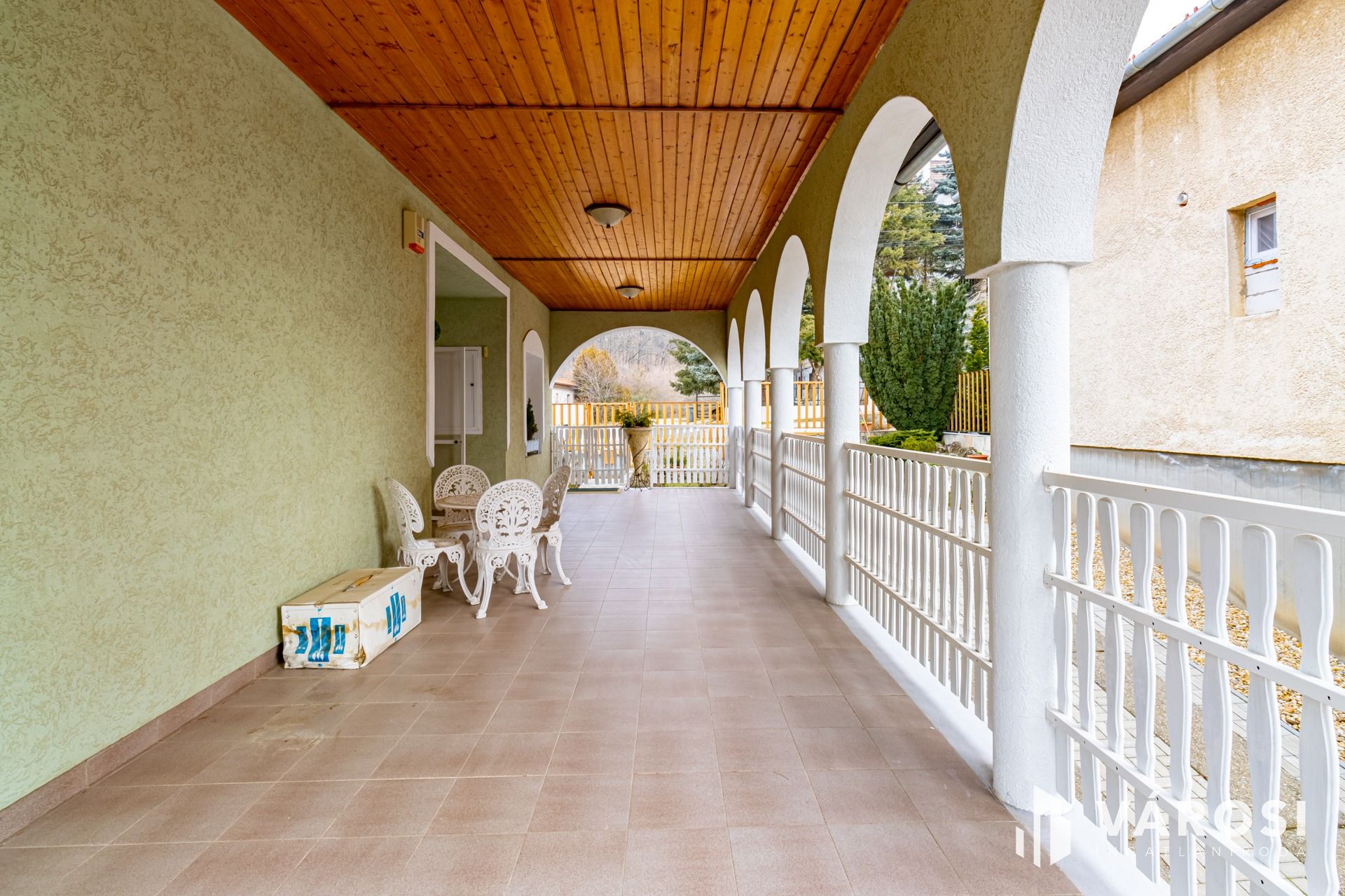 Hatalmas terasz, remek kilátás a környező dombokra, néhány hatalmas ősfenyő is található a ház előtti kertben.
