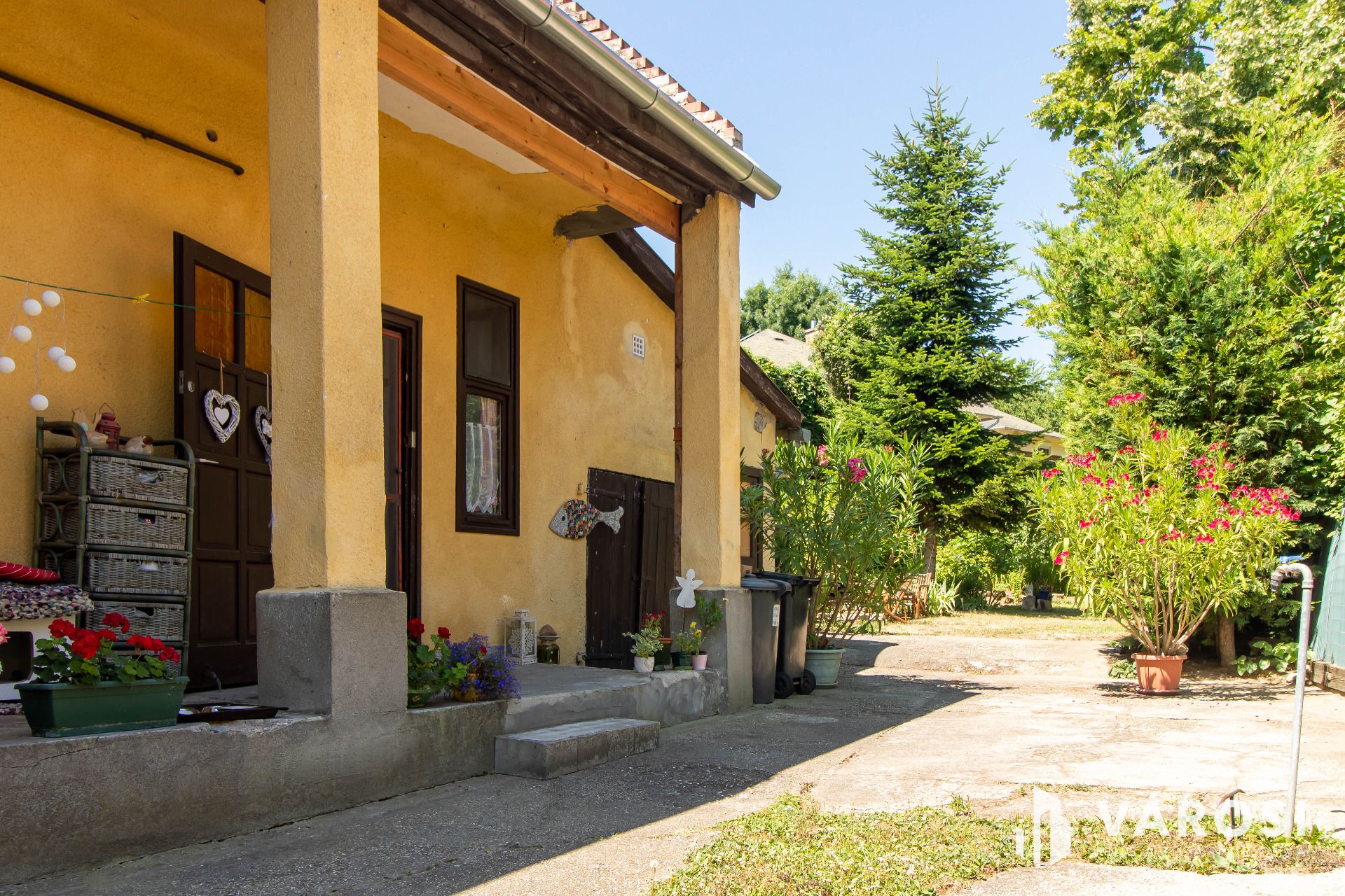 A házhoz tartozik egy pince, tárolóhelyiségek, valamint egy kis fedett terasz is. A kert rendezett, tele virágokkal, kerti kiülővel, a telekhatárt pedig egy körülbelül másfél méter magas, régi kövekből rakott kőfal szegélyezi, amely sajátos hangulatot kölcsönöz az udvarnak. Minden közmű be van vezetve, az ingatlan infrastruktúrája teljes. A környéken karnyújtásnyira megtalálható minden fontos szolgáltatás: bolt, iskola, óvoda, orvosi rendelő, tömegközlekedés – tényleg csak pár lépésre van minden.