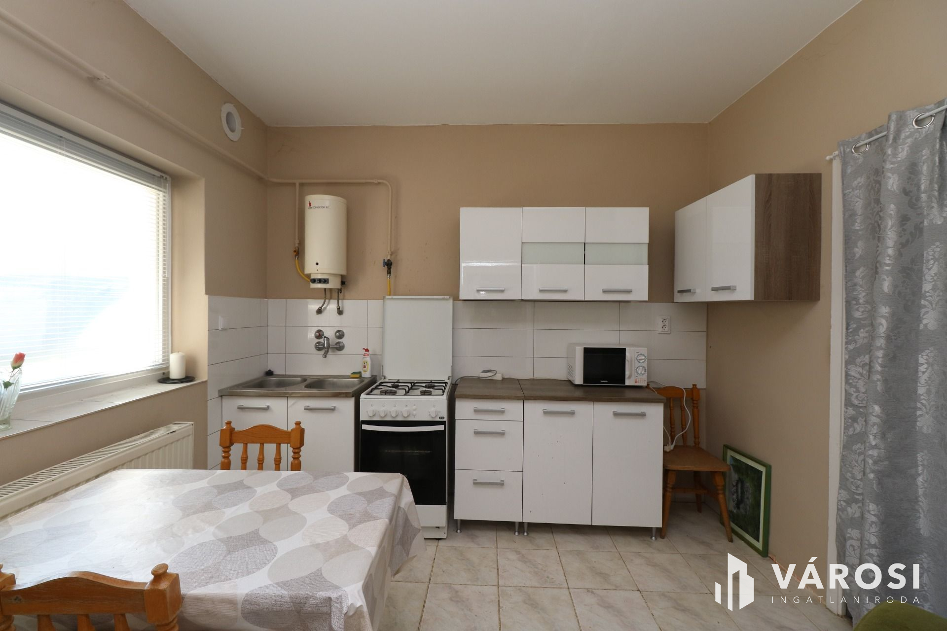 - Konyha, kamra, tusoló + WC járólapos