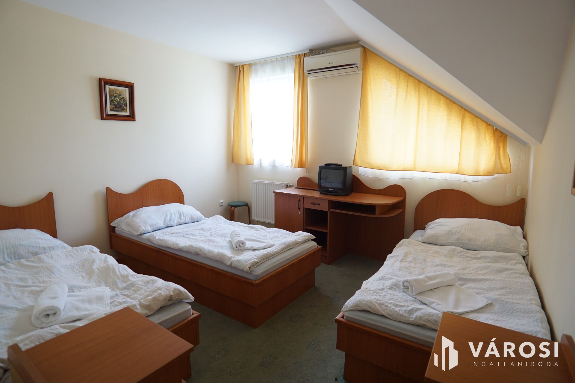 Felső szint: közlekedő, iroda, 8 külön bejáratú szoba saját vizesblokkal, háztartási helység, szolgálati helység. Az ingatlan környezete parkosított, gépkocsival körbejárjató. A vendégek részére térkőburkolattal ellátott parklók állnak rendelkezésre. Az ingatlanhoz tartozik még egy külön telek is ami az épület közvetlen szomszédságában található így bármikor van lehetőség a