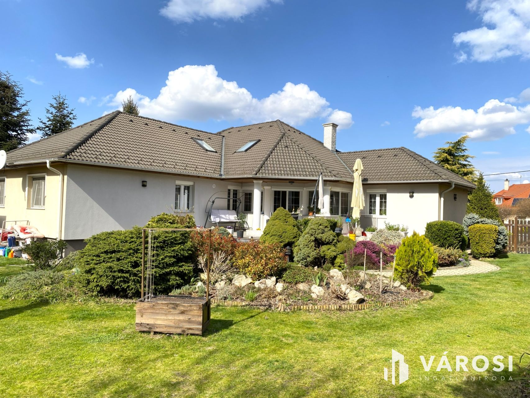 A szobák laminált parketta, a többi helység kerámia burkolatokkal rendelkezik. A házhoz egy nagy, kerámialappal burkolt terasz kapcsolódik, amely közvetlen kapcsolatot teremt a kerttel, emellett praktikus és pihenésre is alkalmas. Automata öntözőrendszer, kerti pavilon, szerszámtároló, bográcsozási lehetőség és magaságyások is kialakításra kerültek. A teljes terület parkosított, rendezett.