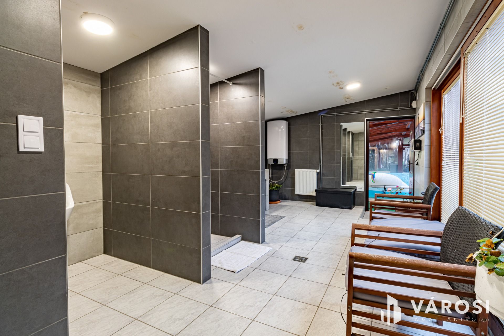 A medence mögött öltöző illetve komplett fürdőszoba és toalett található, ahol mosógép bekötésére is van lehetőség.